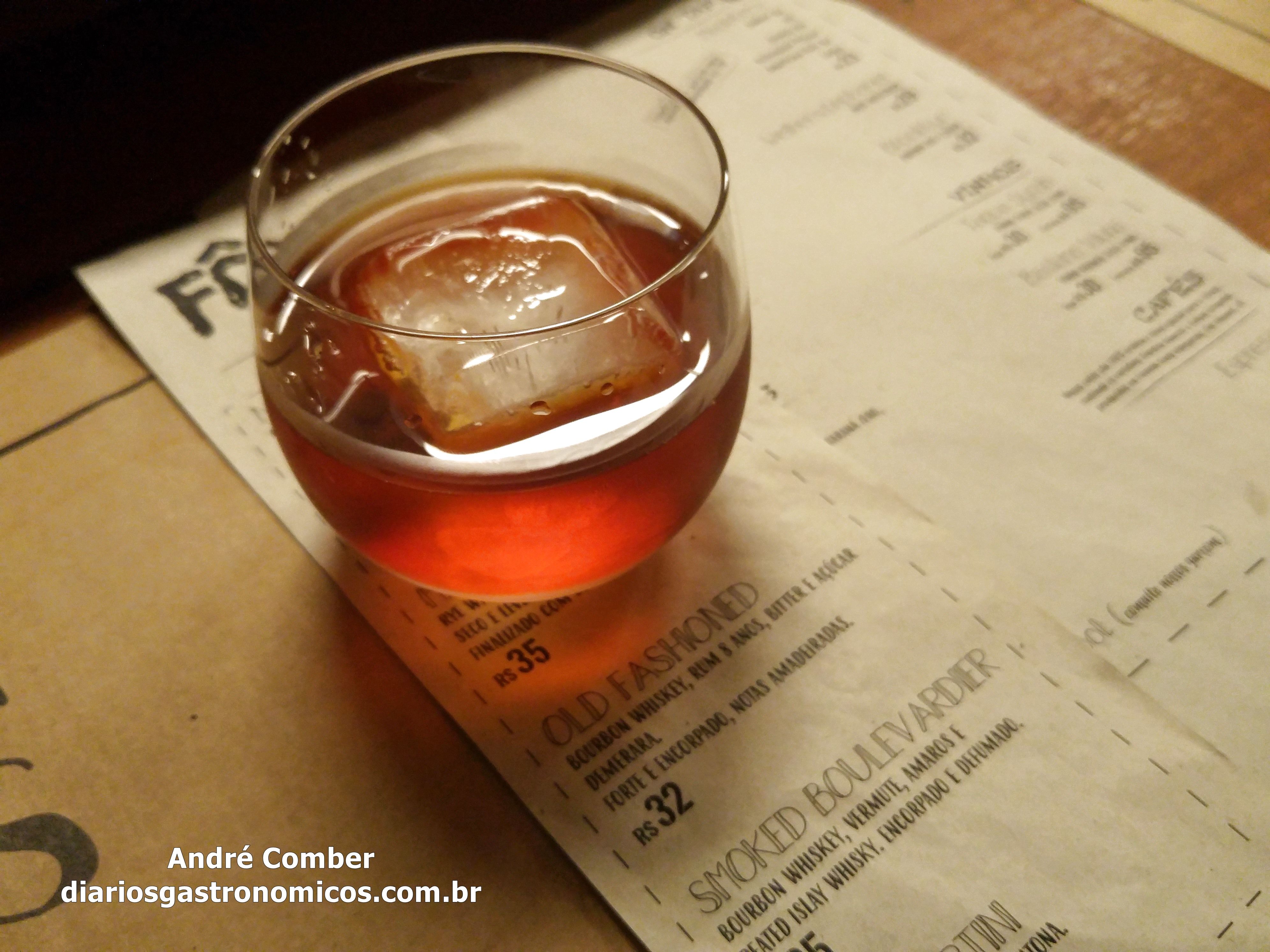 Como ali também é um bar de drinques, não dispensei provar um dos coquetéis da casa. Para ajudar na digestão do sanduba eu pedi o ótimo Smoked Boulevardier, drinque com Bourbon whiskey, vermute, amaros e Islay Whisky.