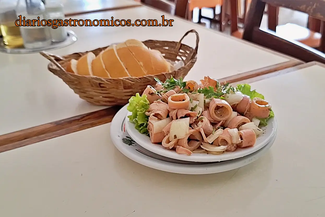 Difícil eu resistir ao Polvo, no entanto resolvi variar um pouco as coisas e começar com uma Lula à Vinagrete. Uma grande porção de anéis de lula vem acompanhada de uma cesta de pães.