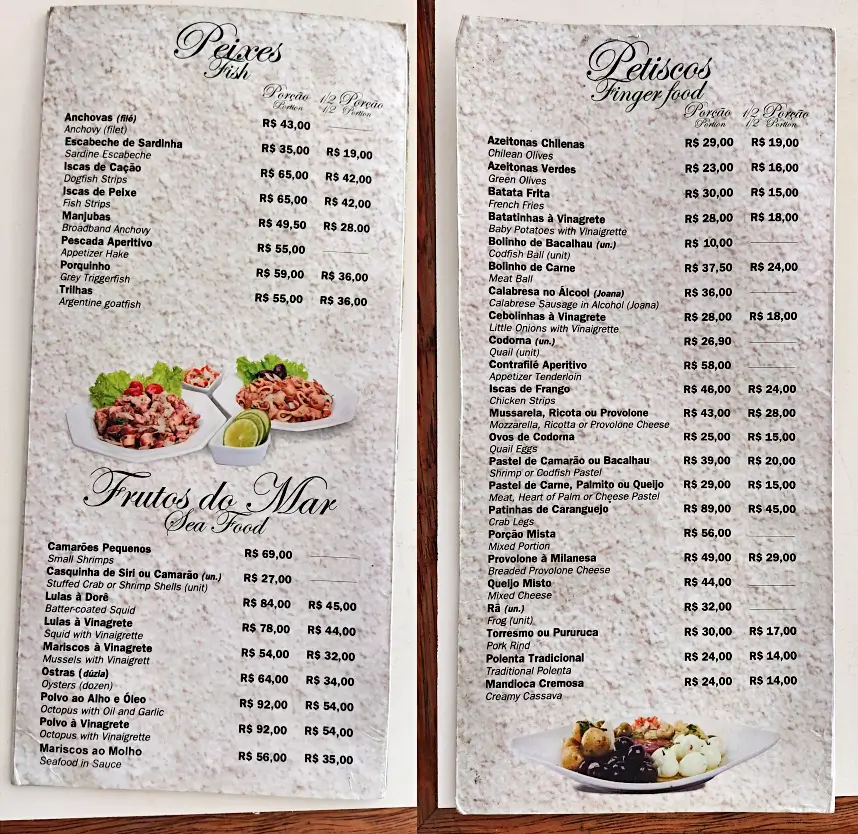 Claro que tem uns petiscos que saem um pouco mais caros, como polvo à vinagrete, por exemplo, já na casa dos 50 reais, mas dificilmente você vai comer muito barato. Ou a Lula à Vinagrete que pedi (R$ 44,00). Mas como disse, porém, a porção era grande. De maneira geral os preços dos frutos do mar, portanto, seguem o padrão de São Paulo.