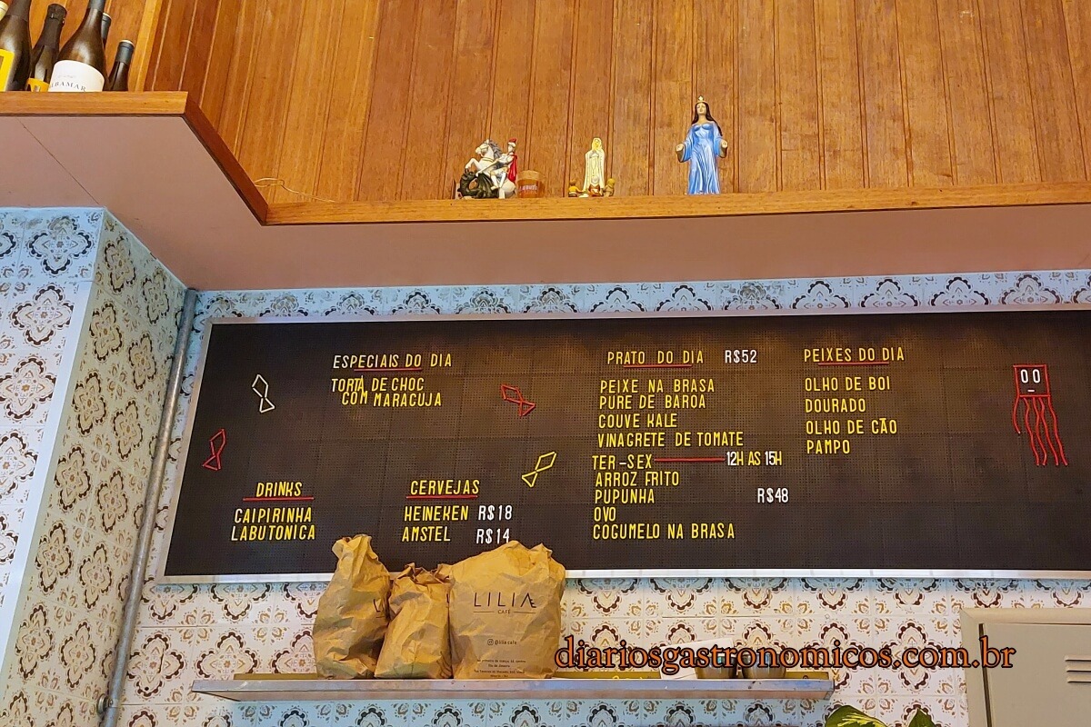 O cardápio se divide entre os petiscos do mar quentes e frios, além das porções para beliscar. Dá para conferir algumas opções frias no balcão do bar. Para quem preferir rangar, há os pratos divisíveis por dois. Na hora do almoço durante a semana rola uns pê-efes que variam a cada dia.