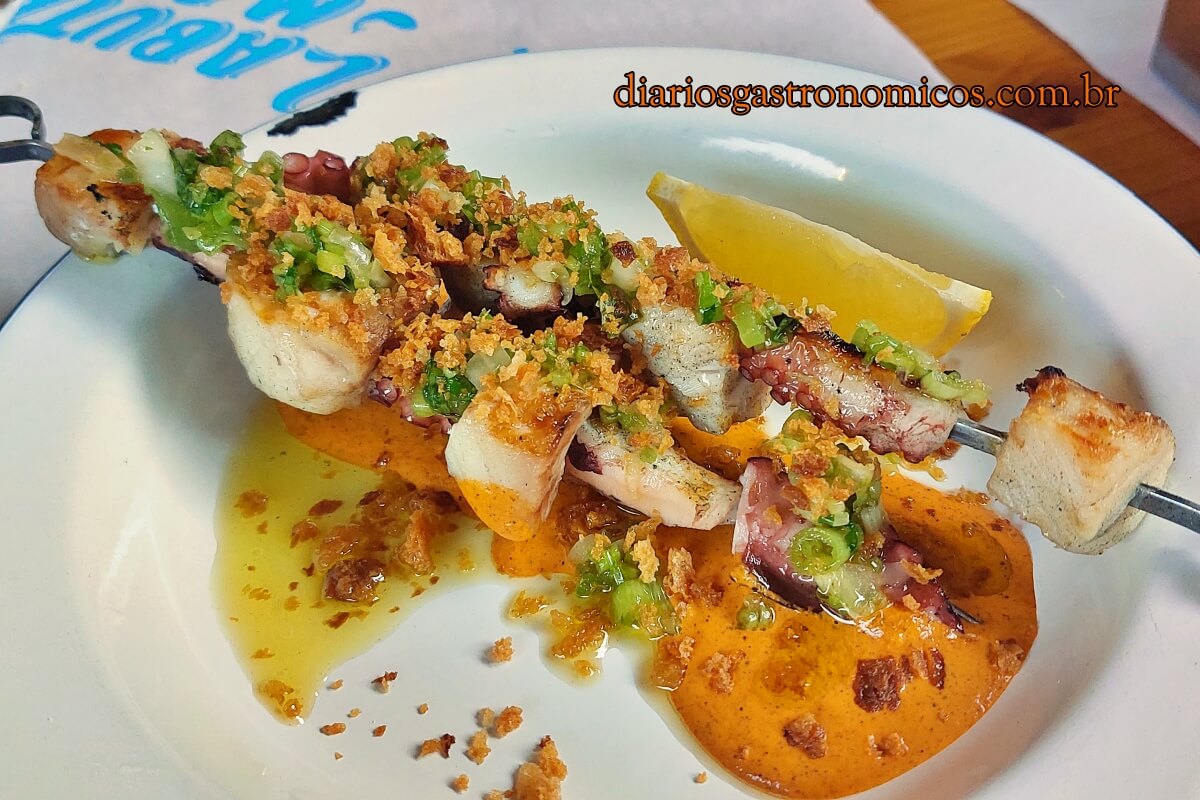 Já nas porções, mandamos vir um Espetinho de Polvo na Brasa com Pimentão Vermelho, Gremolata, bacon de peixe e farofa de pão. Como são dois espetos, dá pra dividir na boa. O polvo faz parceria aqui com cubinhos de peixe. Um petisco leve e bacana.