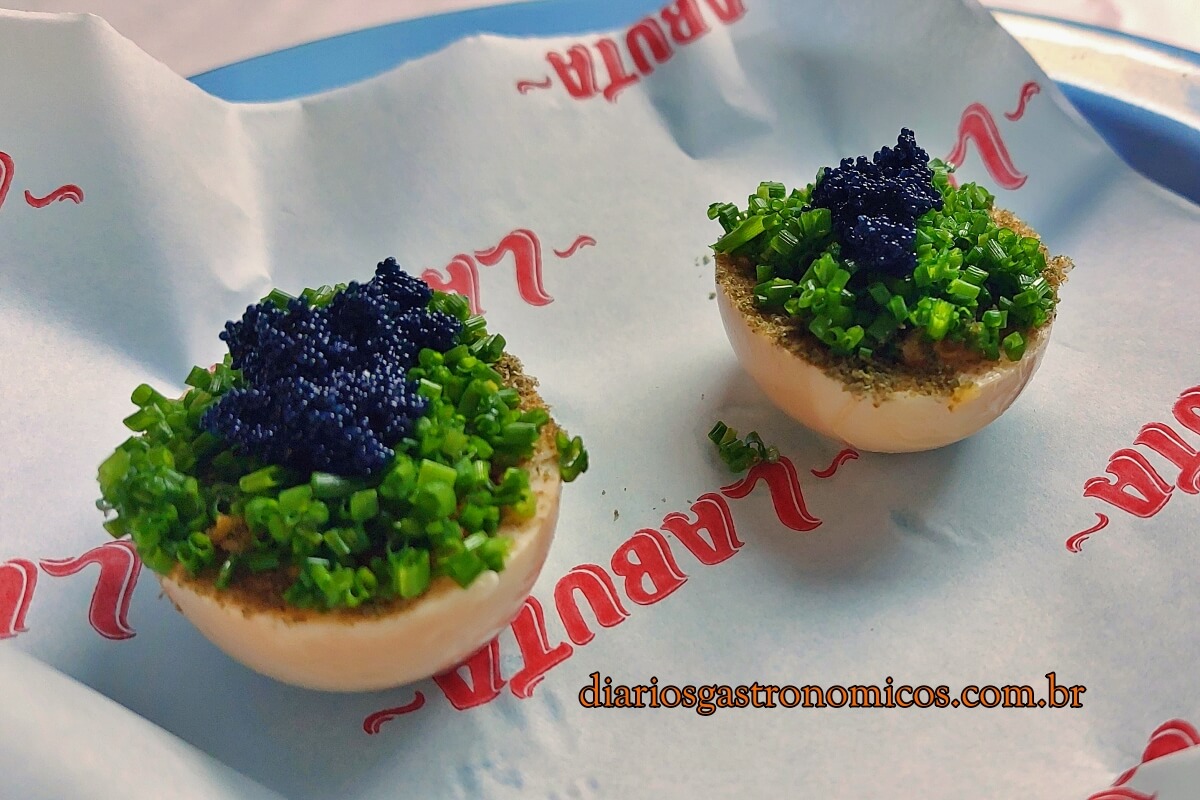 Antes de ir ao Labuta Mar pessoalmente, já tinha me fascinado a imagem do Ovo Marinado com Massago, Maionese japonesa Kew Pie e cebolete que vi no Instagram do bar. Não tirei isso da cabeça.