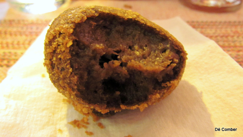 Começamos com o Bolinho de Feijoada (quatro por R$ 16,00). Com tamanho médio, ele é crocante por fora e recheio macio de feijoada batida por dentro. Um troço é muito saboroso. Sem dúvida um dos melhor que comi entre os tantos que começaram a pipocar pela cidade do Rio nos últimos tempos.