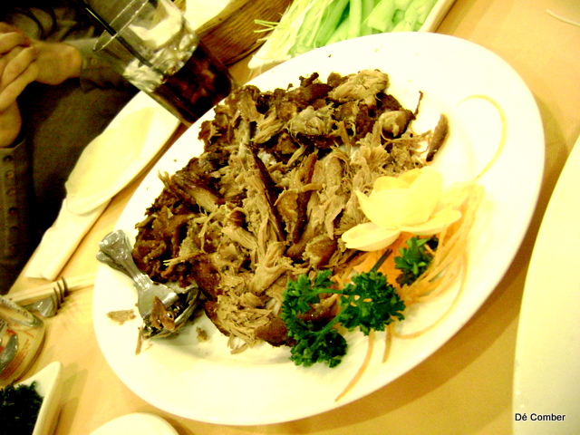 Os pratos são acompanhados por uma espécie de panqueca muito fina e leve, pepino em tiras e alho poró. Come-se envolvendo a carne de pato nas panquecas. Uma delicia!