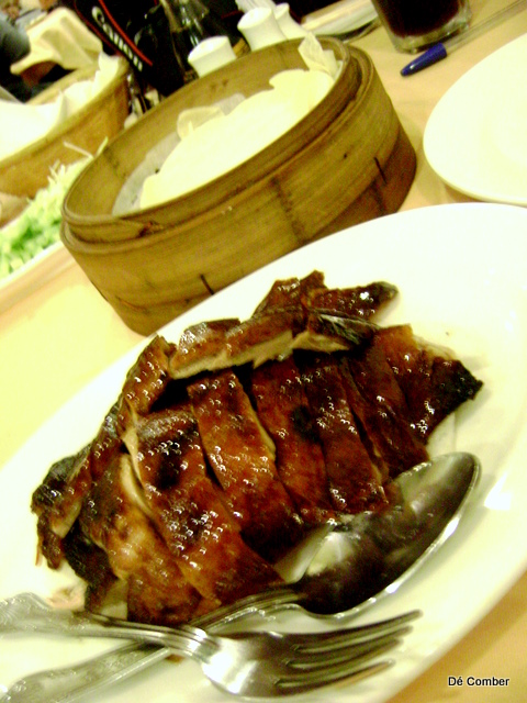 Os pratos são acompanhados por uma espécie de panqueca muito fina e leve, pepino em tiras e alho poró. Come-se envolvendo a carne de pato nas panquecas. Uma delicia!