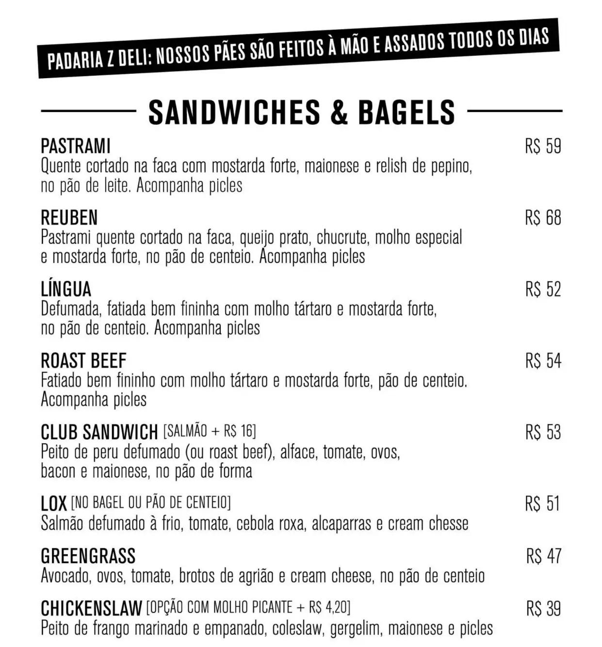 Para fechar, vale esclarecer que o cardápio da Z Deli vai muito além dos 3 sanduíches citados no texto. Há uma parte só dedicada aos hambúrgueres. Também se destacam os bagels, como o Lox, com salmão defumado. Ainda rola um hot dog com salsicha produzida por eles. Esse ainda tenho de provar…