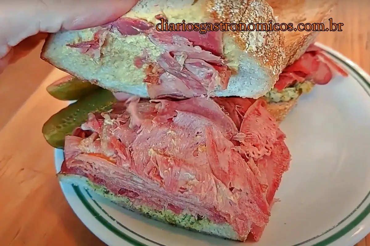 Junto das fatias de pastrami defumado, o sanduba leva relish de pepino, mostarda e maionese caseiras. Tudo é preparado por eles de forma artesanal.